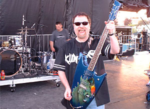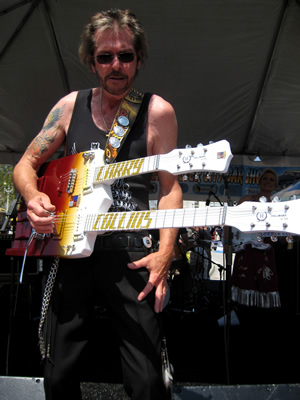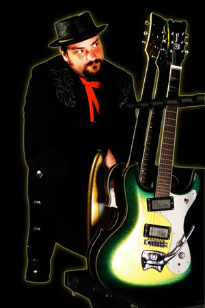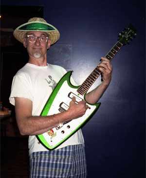Here's Rick Miller from none other than Southern Culture On The Skids hanging backstage with his Swept-Wing guitar in green sparkle complete with Rat Fink sticker and color coordinated hat. Party on Rick! For more information on Rick and S.C.O.T.S. click here!